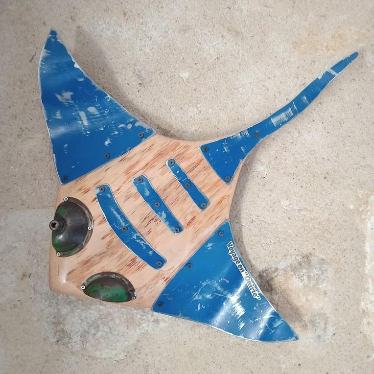 ![]() Voyage enTotem upcycling à suspendre : une raie en cèdre et métal de récup + éléments de moulin à café ancien.Dimensions : (H)62x(L)65cm